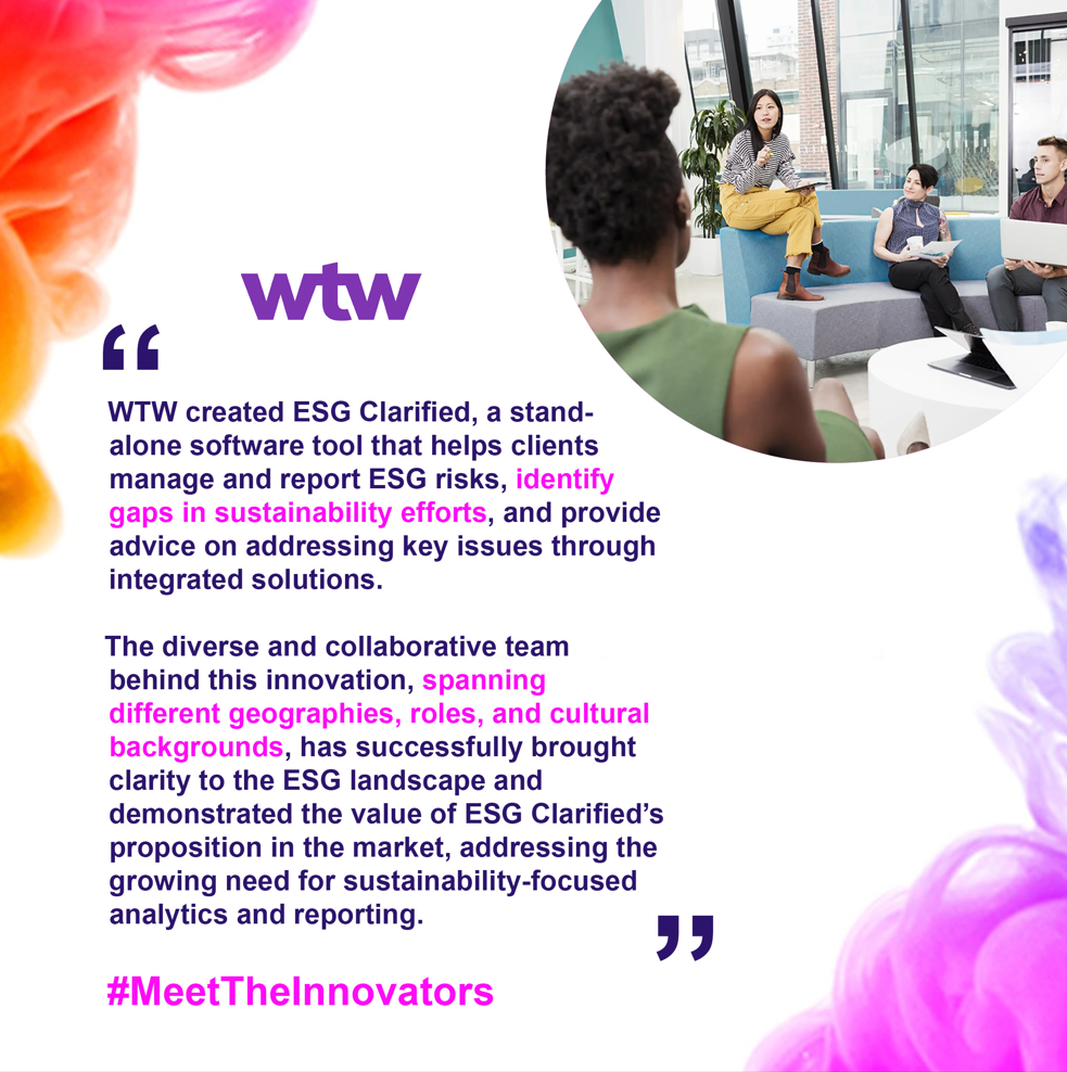 "WTW created ESG Clarified, a stand-alone software tool that helps clients manage and report ESG risks, identify gaps in sustainability efforts, and provide advice on addressing key issues through integrated solutions.