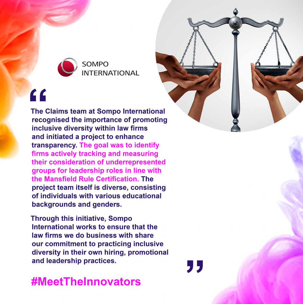 "The Claims team at Sompo International recognised the importance of promoting inclusive diversity within law firms and initiated a project to enhance transparency. The goal was to identify firms actively tracking and measuring their consideration of underrepresented groups for leadership roles in line with the Mansfield Rule Certification. The project team itself is diverse, consisting of individuals with various educational backgrounds and genders.